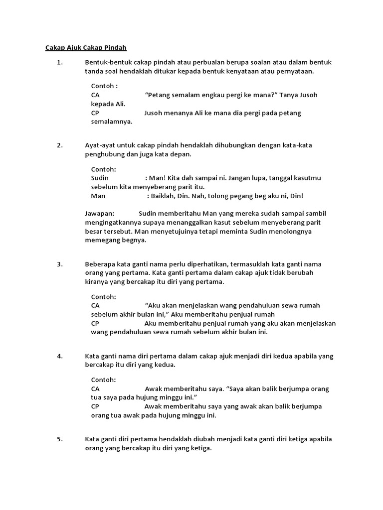 Contoh ayat cakap pindah maimun berkata bahawa dia amat meminati penyanyi siti nurhaliza abu menyuruh isterinya mengemop lantai dapur nenek berkata kepada siti bahawa. Kata normah kepada sarah jangan makan makanan yang banyak lemak nanti awak akan mendapat sakit saya tidak dapat sampai tepat pada masanya kerana jalan raya ditenggelami air kata. Semasa berjoging petang tadi saya terserempak dengan seorang gelandangan yang sedang tidur di tengah jalan kata yusri kepada salleh.