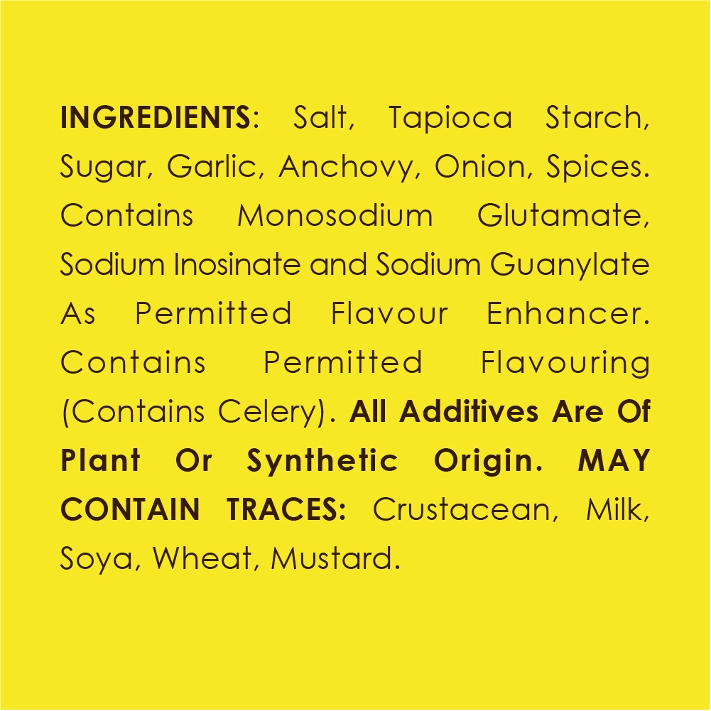 Salt tapioca starch sugar garlic anchovy onion spices contains monosodium glutamate sodium inosinate and sodium guanylate as permitted flavour enhancer contains permitted flavouring contains celery all additives are of plant or synthetic origin. Heat oil in a wok deep fry the batter with high heat.
